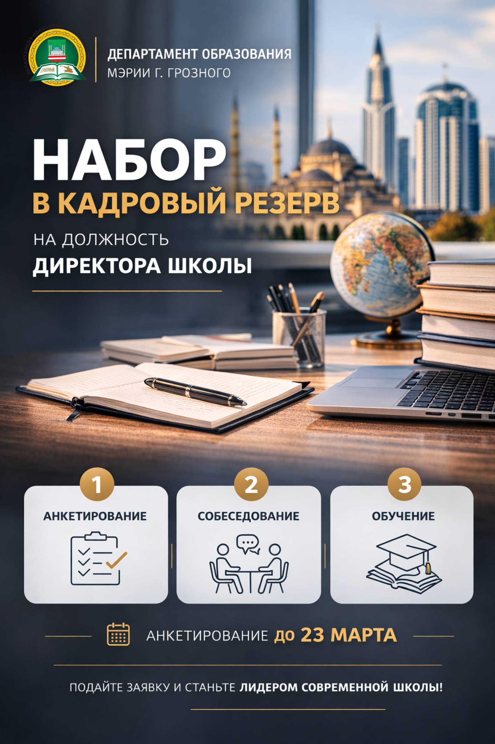 В ГРОЗНОМ ОБЪЯВЛЕН НАБОР В КАДРОВЫЙ РЕЗЕРВ ДИРЕКТОРОВ ШКОЛ В РАМКАХ ПРОЕКТА «ДИЗАЙНЕРЫ ОБРАЗОВАНИЯ». В рамках реализации проекта «Дизайнеры образования» Департамент образования Мэрии города Грозного запустил новый трек «Управленцы» для создания ...