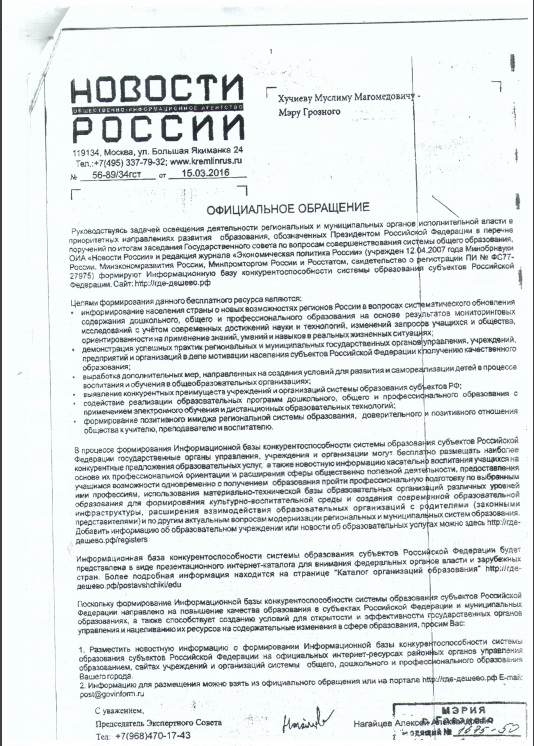 Письмо председателя Экспертного Совета общественно-информационного агентства Новости России А.А.Нагайцева